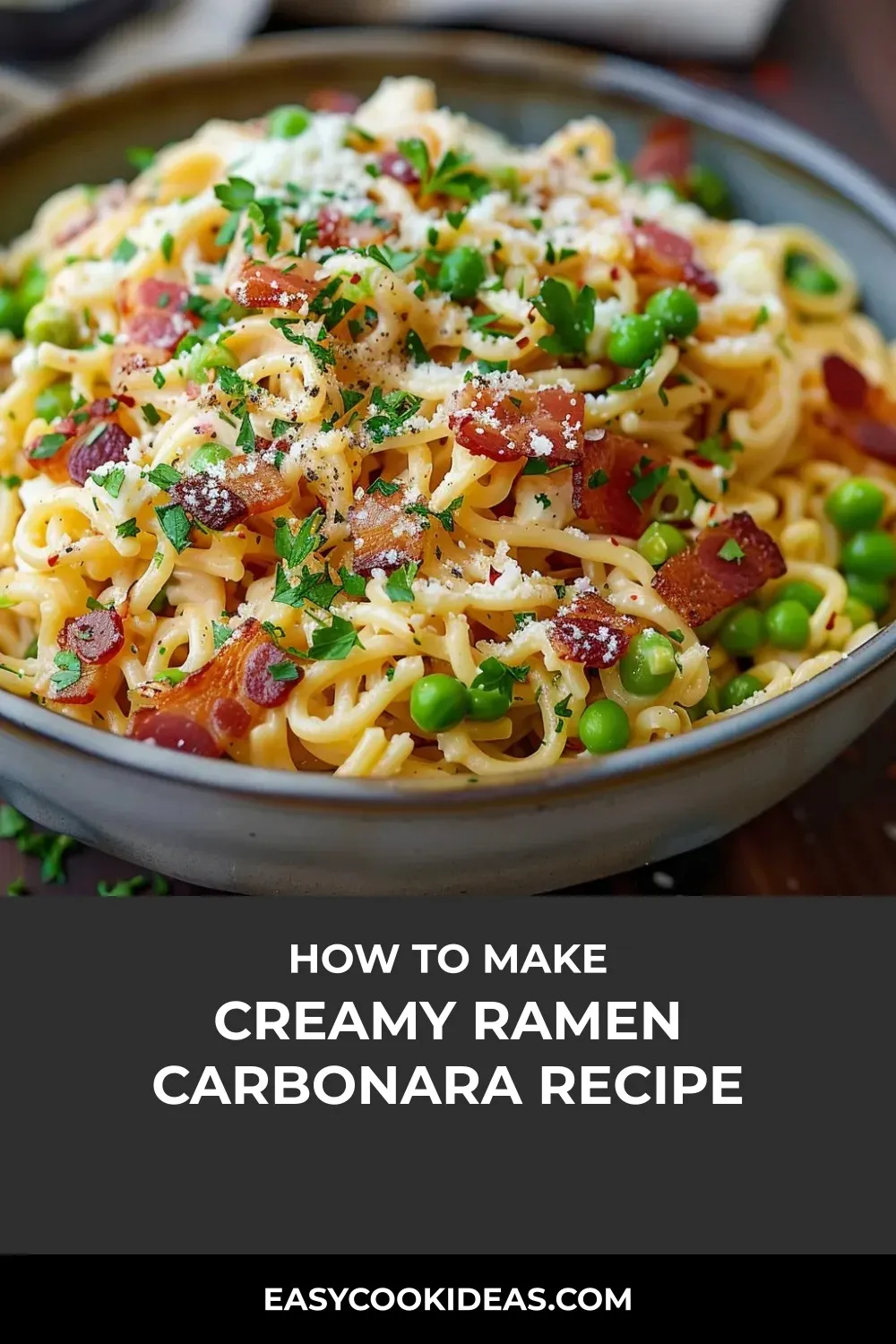 Feel free to customize this ramen carbonara to suit your preferences and pantry staples. Swap out bacon for pancetta, prosciutto, or even a vegetarian option like mushrooms sautéed with smoked paprika. You can also experiment with different cheeses like Pecorino Romano or nutritional yeast for a vegan twist. Don’t hesitate to switch up the veggies too – asparagus, spinach, or cherry tomatoes all make delicious alternatives to peas based on what you have on hand or prefer.