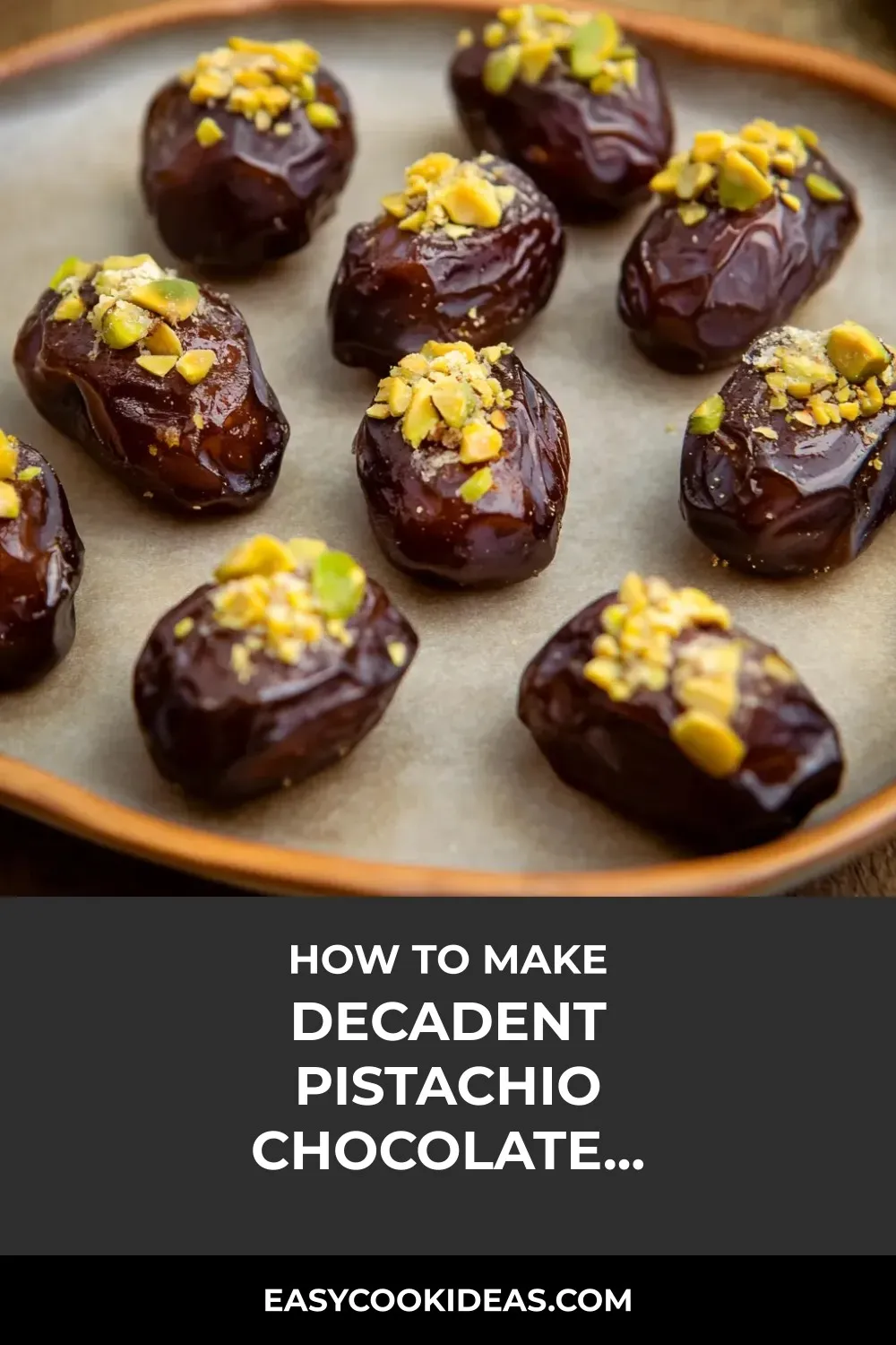 Garnish and Chill: Top the chocolate-covered dates with chopped pistachios and chill in the refrigerator for 20 minutes until the chocolate hardens.