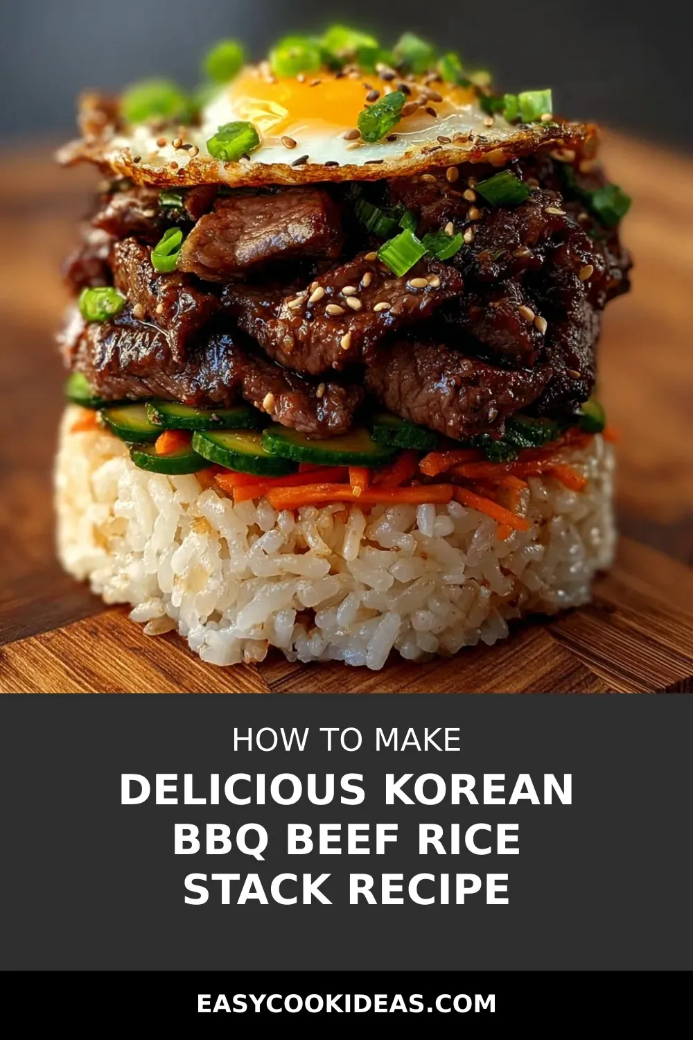 “Korean BBQ Beef Rice Stack: Layers of marinated beef, seasoned rice, and fresh veggies stack up for a burst of flavor and impressive presentation.”