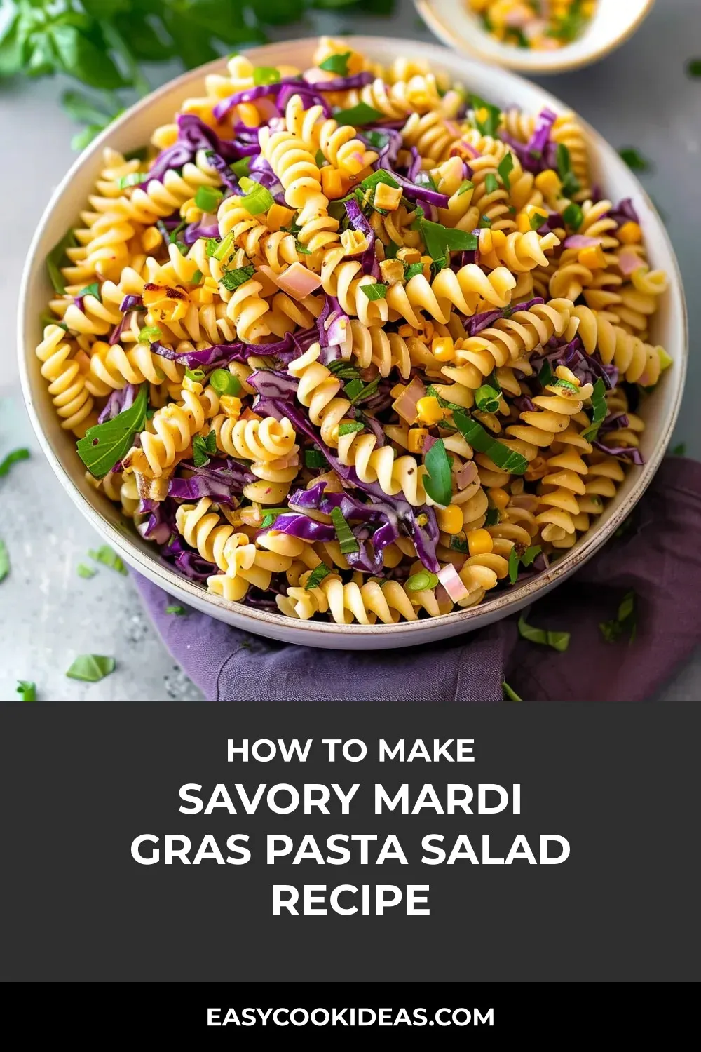 “Vibrant Mardi Gras Pasta Salad: a colorful celebration on your plate, featuring spiral pasta, purple cabbage, sweet corn, and zesty green onions.”