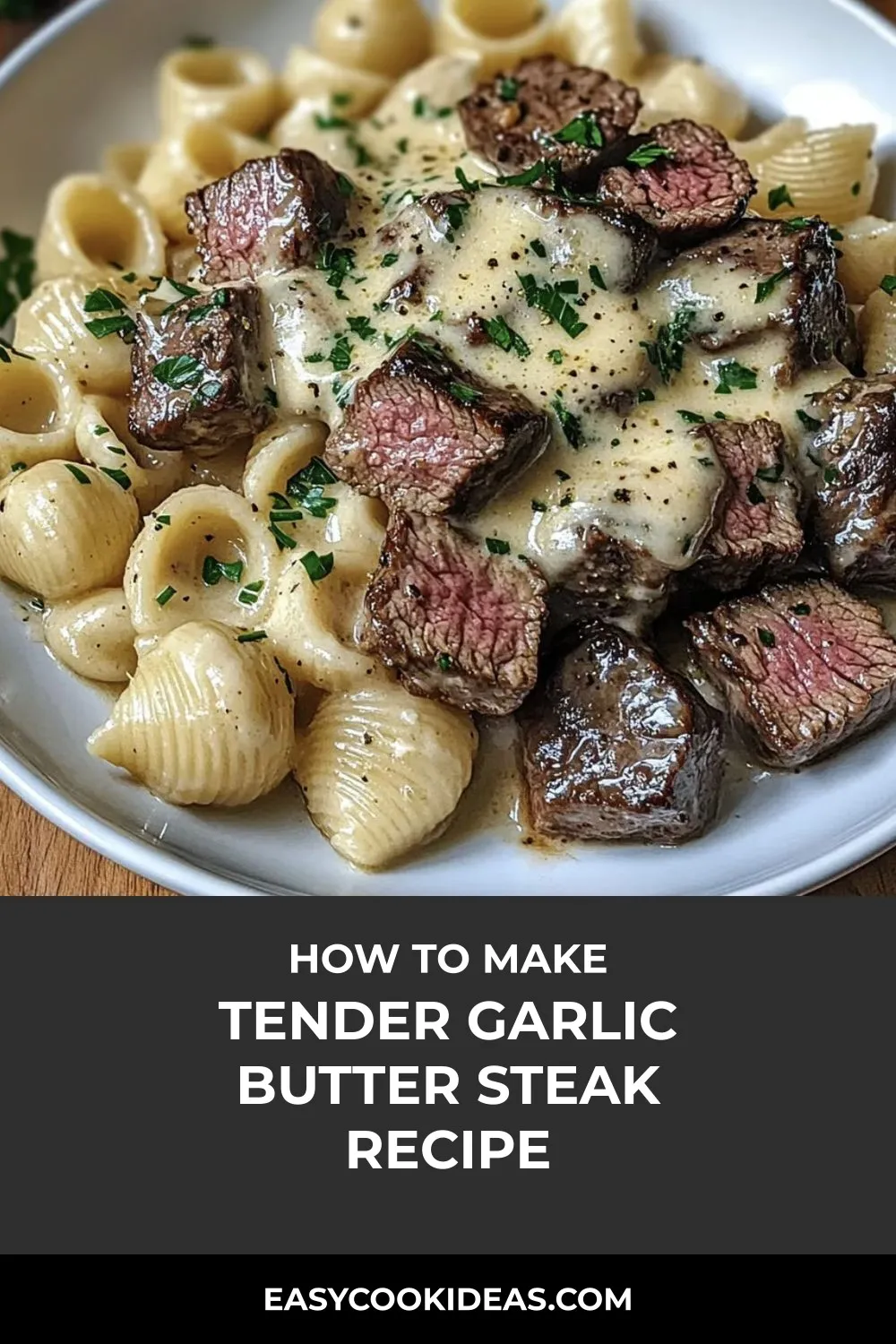 Top the creamy Parmesan Alfredo shells with steak bites and sprinkle with chopped parsley before serving.