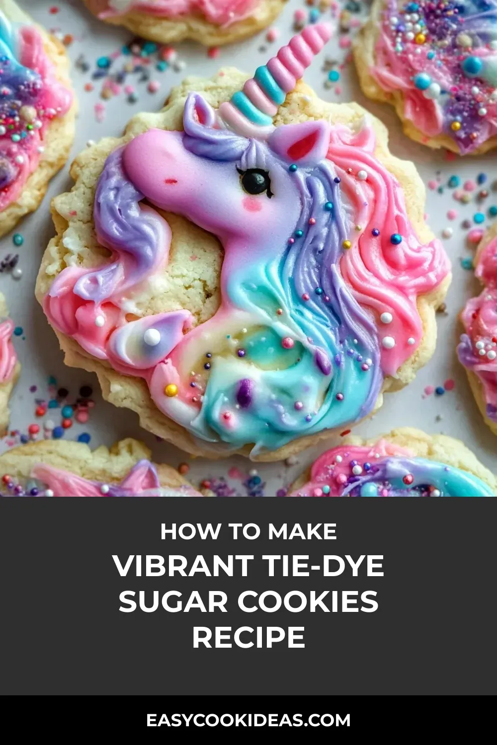 “Magical Tie-Dye Sugar Cookies – create whimsical, rainbow-swirled treats with marbled dough and colorful sprinkles for a touch of magic!”